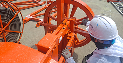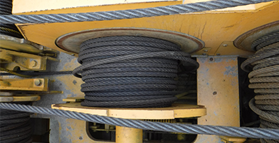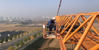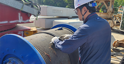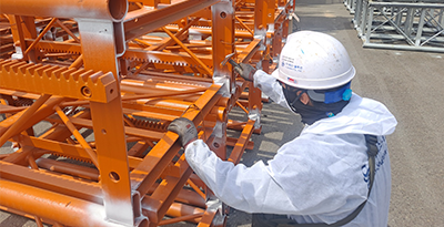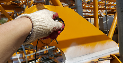 1) 구조부분 : Mast, Jib 외관검사(비틀림, 휨, 균열, 부식, 도장 훼손 여부) ① Trolley 주행장치 : 조립볼트 규격, 풀림 여부, Roller, 각종 스위치 상태 등 ② Sheave 및 Pin : Sheave 홈 및 암, 보스 부 마모, 부식, 균열 여부 등 ③ Hook 및 Wire Rope : 손상, 균열, 파단, 마모 및 부식 상태 등 ④ 기타 장치의 균열, 변형, 훼손 및 마모 상태 등 점검 |